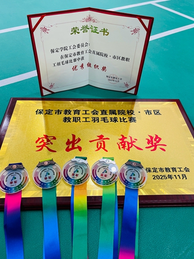 保定市教育工会直属院校·市区教职工羽毛球比赛于11月24日至25日在保定市工人文化宫羽毛球馆成功举办。本次比赛由市教育工会主办,来自河北大学、河北农业大学、华北电力学院、保定学院、等11所驻保高校及市、区教育工会100余名选手参赛。我校选派优秀选手组队参赛,各位选手在比赛中充分展现了我校教职工拼搏、团结、有活力的精神风貌。经过两天激烈角逐,金成、李帅获得男双组亚军,刘京花、吴伯丹获得混双组季军,刘宾获得男子单打组季军。我校获的突出贡献奖和优秀组织奖。